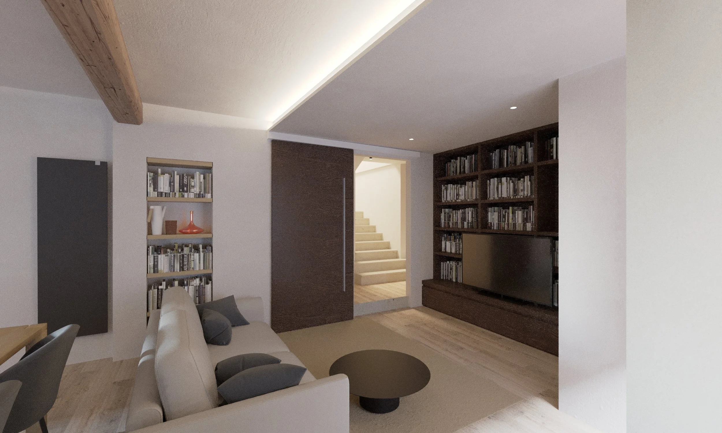 Inizialmente sviluppata in uno spazio di cantina e ingresso al piano terra relegando gli spazi abitativi solo al piano primo, è stata interamente ripensata andando a dilatare l’abitazione anche al piano terra con un grande soggiorno cucina, lasciando al piano superiore solo la zona notte.