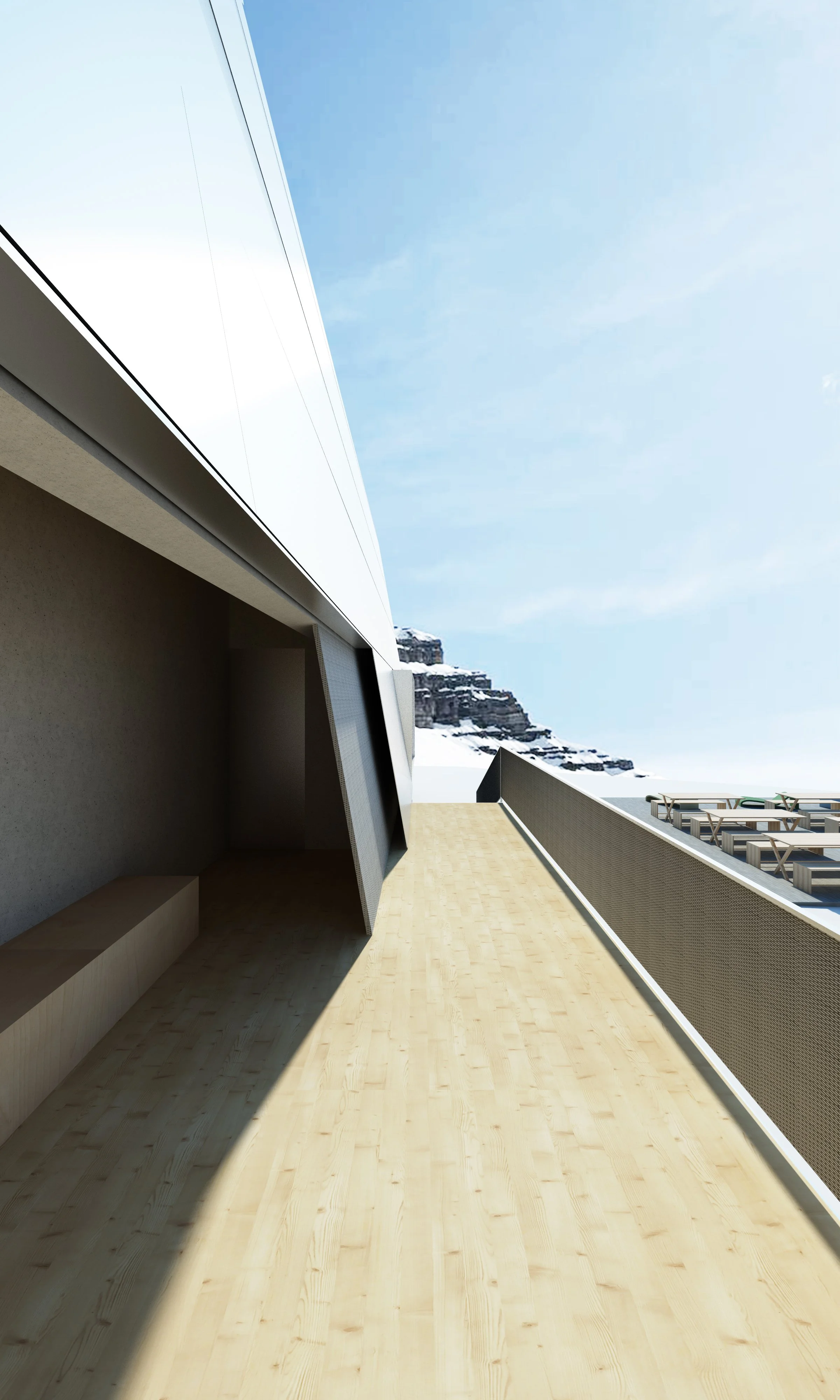 Questo elemento lineare, in giustapposizione alla forma più tozza del rifugio esistente, andrà a definire un nuovo spazio di relazione sul fronte del rifugio, proteggendolo e ricalcando allascala architettonica la funzione che il massiccio di dolomia adempie alla scala territoriale.